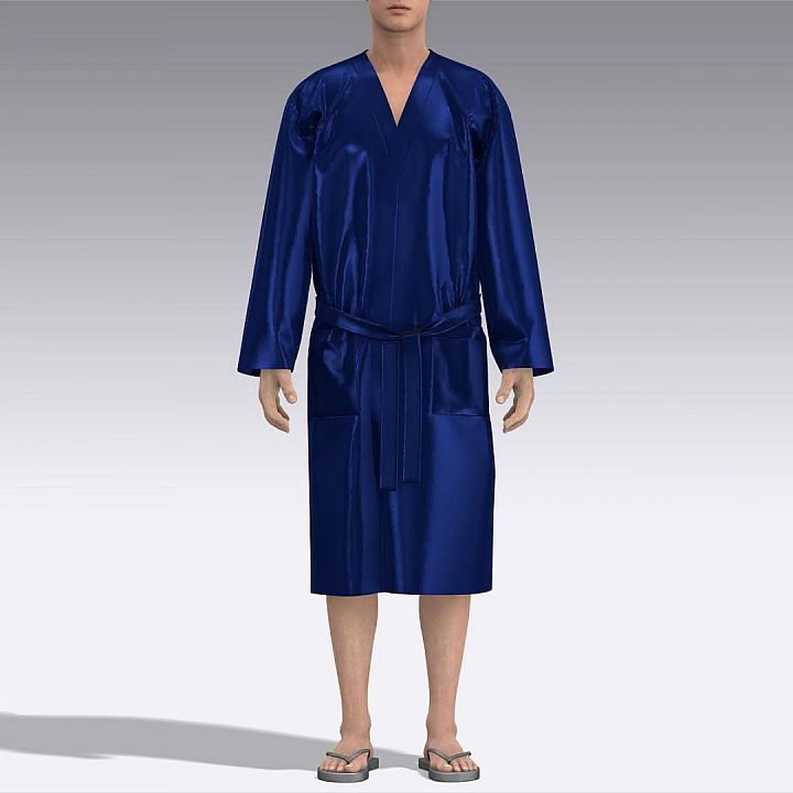 Халат с запахом ниже линии колен из натурального шёлка, с двумя карманами. Рукав длинный прямой. V-образный вырез горловины. По горловине и краю борта двойная планка. Чистая обработка швов. Халат завязывается на продетый через боковые шлёвки пояс и полодержатели.