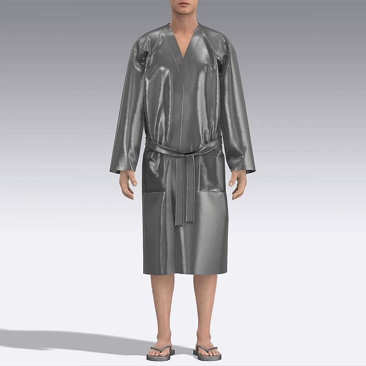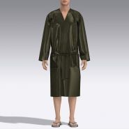 Халат с запахом ниже линии колен из натурального шёлка, с двумя карманами. Рукав длинный прямой. V-образный вырез горловины. По горловине и краю борта двойная планка. Чистая обработка швов. Халат завязывается на продетый через боковые шлёвки пояс и полодержатели.