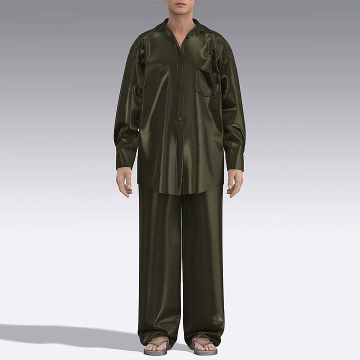 Мужская пижама из натурального шелка. Рубашка длиной до середины бедер с застежкой на потайные кнопки, с одним нагрудным карманом, сзади на кокетке. Отложной воротник. Рукава длинные, на манжетах. Брюки длинные, без карманов, на резинке. Чистая обработка швов. Широкий размерный ряд.