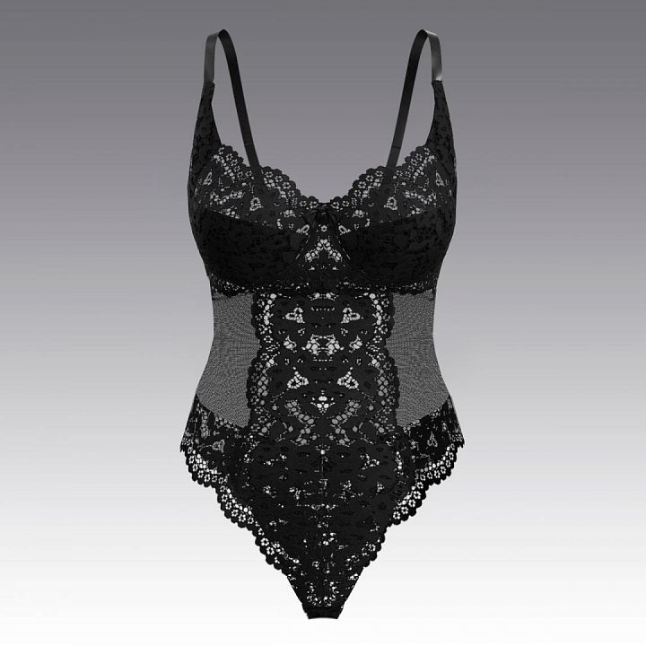 Боди с мягкой чашкой из ажурного кружева и сетки. Мягкие чашки с горизонтальным рельефом и боковым подрезом, на косточках, хорошо держат грудь. Ширина бретели от 15 до 20 мм. Боковые детали из сетки. U-образная форма спинки. Сзади – застежка на 2 крючка в средних размерах и на 3 крючка в больших размерах. Комфортные ощущения при носке сохраняются благодаря ластовице, застегивающейся на крючки и петли.