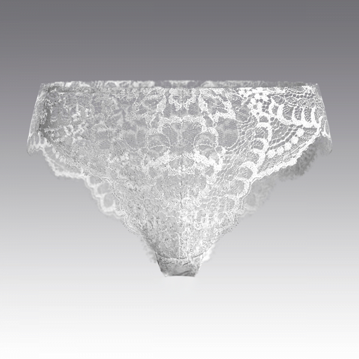 Трусы выполнены из кружева. Спереди сверху и вдоль нижнего края  большие фигурные симметричные вставки  из неэластичного кружева. Спереди по центру маленький атласный бантик. Ластовица из хлопка.
