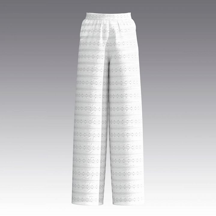 Прямые брюки в из тонкого батиста с шитьем. В боковых швах - удобные карманы. Благодаря рисунку и драпировке изделие не просвечивает, но рекомендуется надевать белье телесного цвета или в тон. Широкий размерный ряд.
