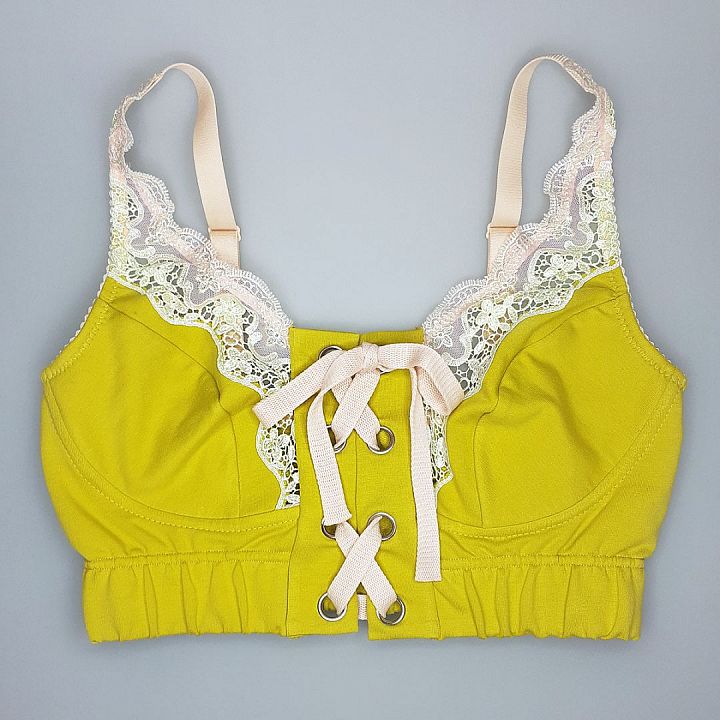 Топ на шнуровке выполнен из модного футера. Мягкие чашки с горизонтальным рельефом, без косточек, хорошо поддерживают грудь. По вырезу отделака ажурной вышивкой. Ширина бретели от 15 до 20 мм. Бретели регулируются по длине. Носить такой топ можно как самотоятельное изделие, а также под жакет или кардиган.