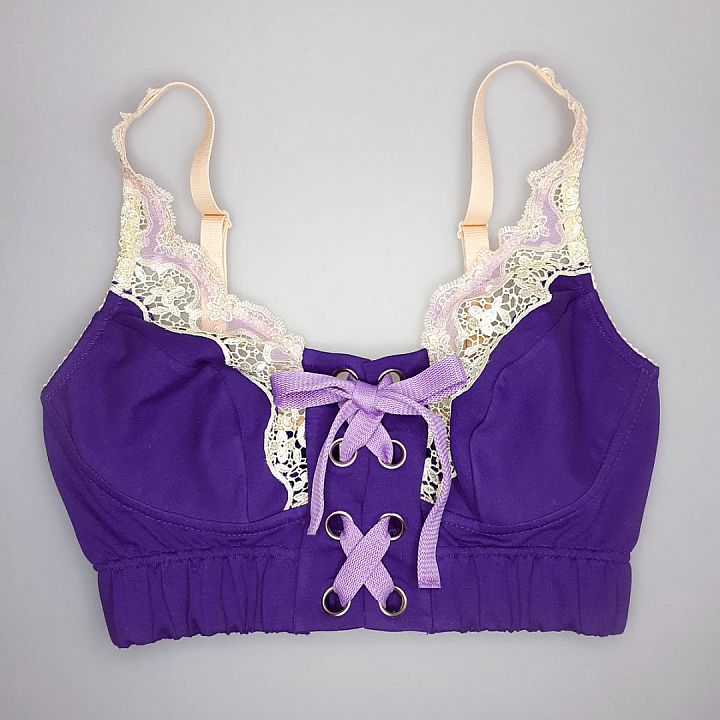 Топ на шнуровке выполнен из модного футера. Мягкие чашки с горизонтальным рельефом, без косточек, хорошо поддерживают грудь. По вырезу отделака ажурной вышивкой. Ширина бретели от 15 до 20 мм. Бретели регулируются по длине. Носить такой топ можно как самотоятельное изделие, а также под жакет или кардиган.