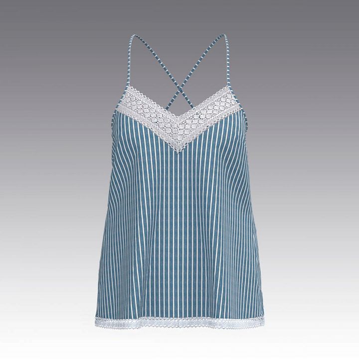 Топ из вареного хлопка в полоску с эффектом "крэш". Отделка плетеным хлопковым кружевом. Топ на тонких регулирующихся бретелях с открытой спинкой. Вареный (стиранный) хлопок - ткань, которая прошла специальную обработку - энзимную стирку. Изделия из вареного хлопка необыкновенно мягкие и приятные к телу. Их можно не гладить, так как после обработки не ткани образуется легкий неравномерный крэш, который выглядит стильно.