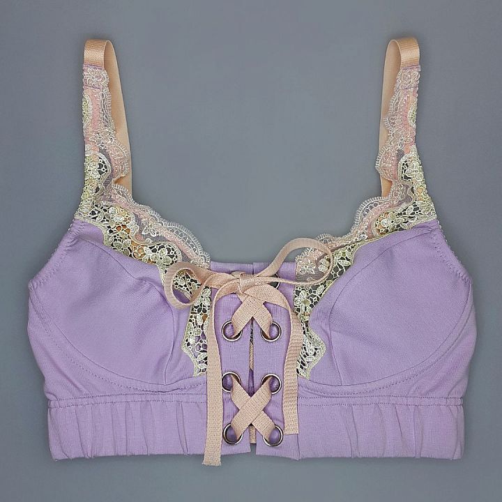 Топ на шнуровке выполнен из модного футера. Мягкие чашки с горизонтальным рельефом, без косточек, хорошо поддерживают грудь. По вырезу отделака ажурной вышивкой. Ширина бретели от 15 до 20 мм. Бретели регулируются по длине. Носить такой топ можно как самотоятельное изделие, а также под жакет или кардиган.