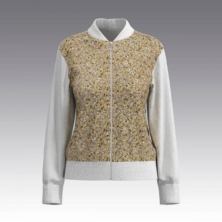 Бомбер из футера и пайеток. Длинный рукав. По низу рукавов резинка. Застежка на молнии. Воротник-стойка, манжеты и пояс из кашкорсе. Удобные потайные карманы в боковых швах. Изделие на подкладке. Благодаря содержанию эластана, не вытянется и не потеряет форму. В комплект можно подобрать брюки из пайеток. Широкий размерный ряд.