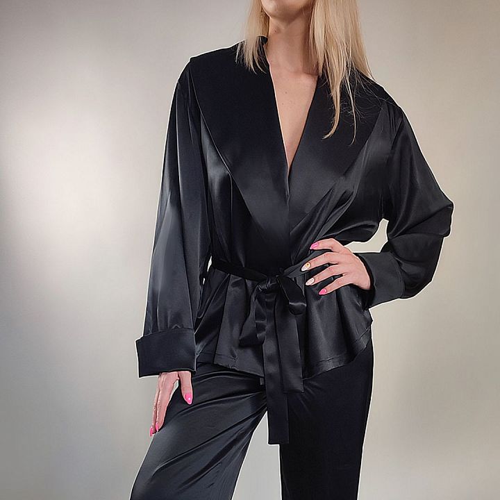 Легкий, приятный к телу жакет-кимоно до линии бедер из натурального шёлка, с воротником покроя "шалька". Шелк, переливаясь, производит эффект богатой раскованности. Кимоно завязывается на пояс, который продевается через шлевки, расположенные по бокам. Рукав длинный, с отворотом. Широкий размерный ряд. В комплект к жакету можно преобрести шелковые брюки в тон. В ассортименте самые модные цветовые оттенки.