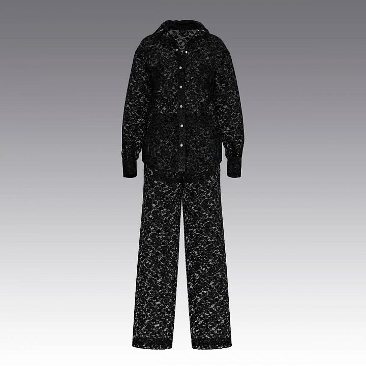 Мягкий, приятный к телу комплект для дома, отдыха и прогулок. Рубашка с длинными рукавами, с отложным воротником на застежке  до низа на кнопках. Выполнена из кружева. Передняя деталь дополнена карманом. В комплекте идут брюки из кружева. Карманы в боковых швах. По талии - широкий пояс на резинке. Широкий размерный ряд.