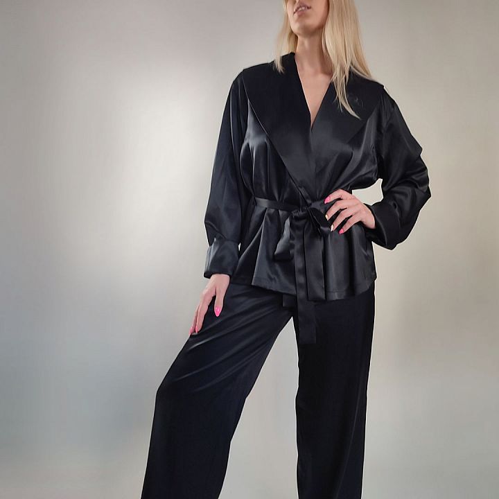 Шелковый комплект - жакет-кимоно и брюки, которым может новиться дома, на отдыхе или как пижама. Легкое, приятное к телу кимоно до уровня бёдер из натурального шёлка, с воротником покроя "шалька". Кимоно завязывается на пояс, который продевается через шлевки, расположенные по бокам. Рукав длинный, с отворотом. Комплект дополняют брюки из шелка. Шикарные, легкие брюки, выполнены из натурального шелка. Талия на резинке. В ассортименте самые модные цветовые оттенки. Широкий размерный ряд.