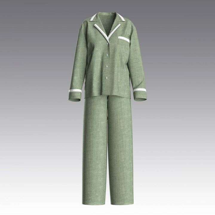 Костюм в пижамном стиле из вареного хлопка в полоску с эффектом "крэш". Жакет с английским воротником с отложными лацканами, с нагрудным карманом, длинным рукавом на манжетах. Силуэт - легкий "оверсайз". Отделка плетеным хлопковым кружевом. Застежка на кнопки из нержавеющей стали. Длинные прямые брюки с боковыми карманами, на резинке.