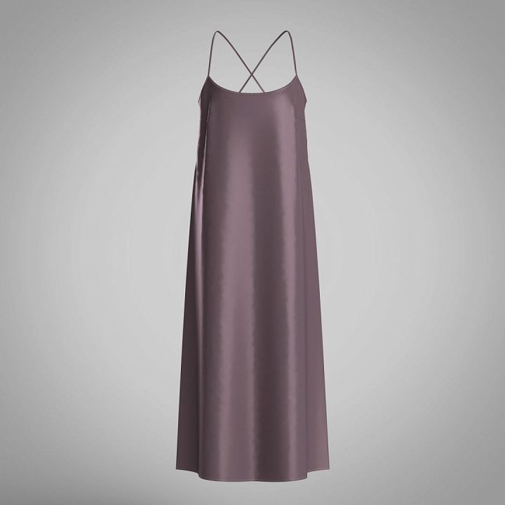 Платье-комбинация из натурального шелка полуприлегающего силуэта длиной до щиколотки выглядит изысканно и легко «скрадывает» некоторые изъяны фигуры. Тонкие регулирующиеся бретели красиво перекрещиваются на спине. Универсальность и роскошный внешний вид позволяет носить изделие и как ночную сорочку, и как коктельное платье. Широкий размерный ряд.
