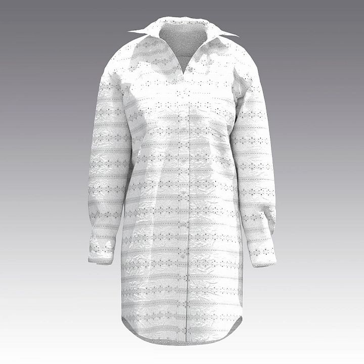 Платье-рубашка из батиста с шитьем силуэта легкий оверсайз. Длинные рукава на манжетах, отложной рубашечный воротник, застежка на кнопках. Спереди два кармана. Планка, кокетка и манжеты продублированы вторым слоем ткани. Благодаря вышивке и драпировке изделие не просвечивает, но рекомендуется надевать белье телесного цвета или в тон. Широкий размерный ряд.