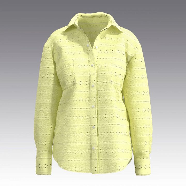 Рубашка из нежного батиста с шитьем силуэта легкий оверсайз. Длинные рукава на манжетах, отложной рубашечный воротник, застежка на кнопках. Спереди два кармана. Планка, кокетка и манжеты продублированы вторым слоем ткани. Благодаря рисунку и драпировке изделие не просвечивает, но рекомендуется надевать белье телесного цвета или в тон. Широкий размерный ряд.